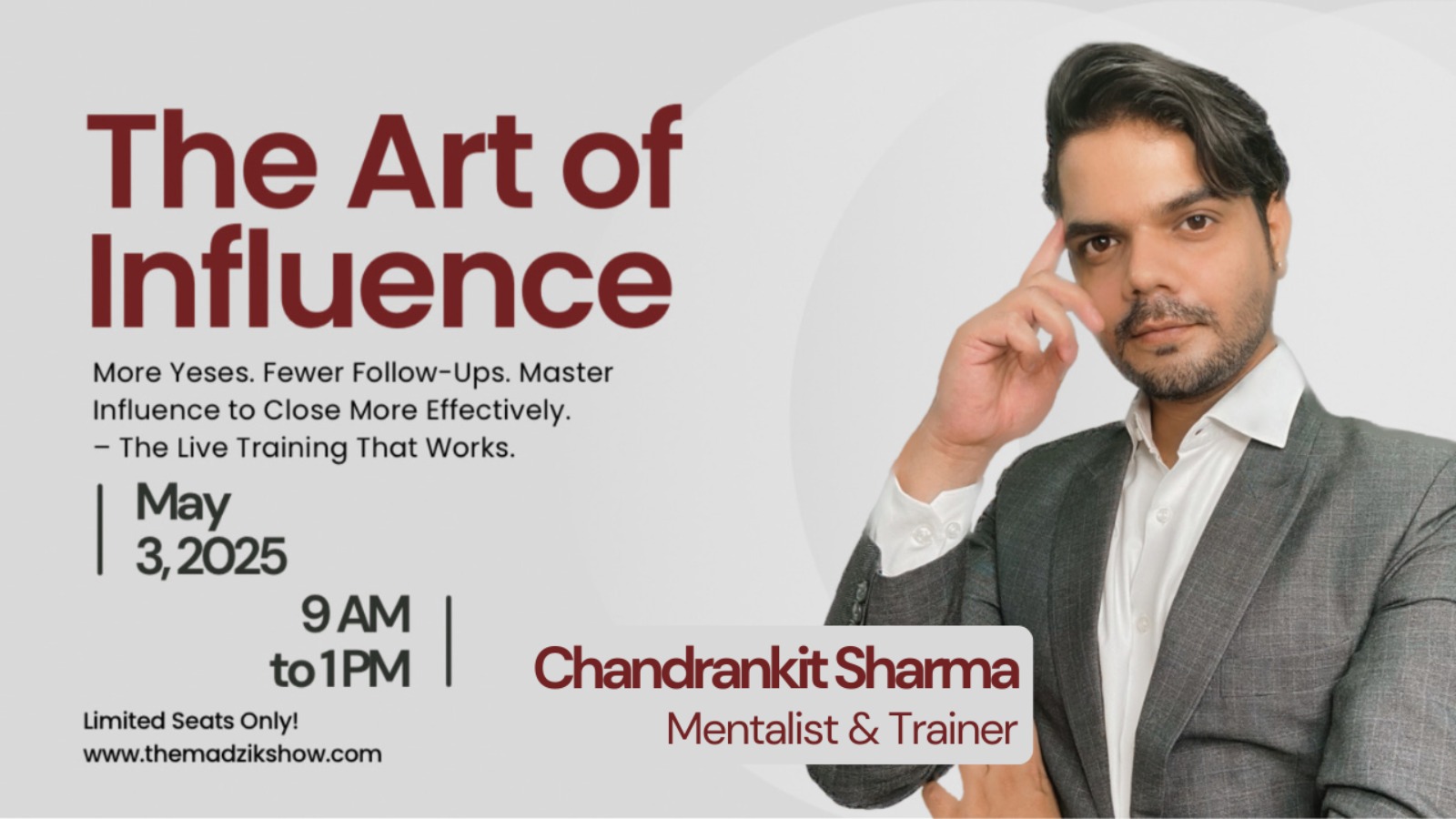 Influence isn’t manipulation — it’s a mindset, a skill, a superpower. After captivating the minds of top CEOs, global leaders, celebrated personalities, and ultra-high-net-worth individuals, Mentalist Chandrankit Sharma presents a transformative workshop designed to decode the art of influence.